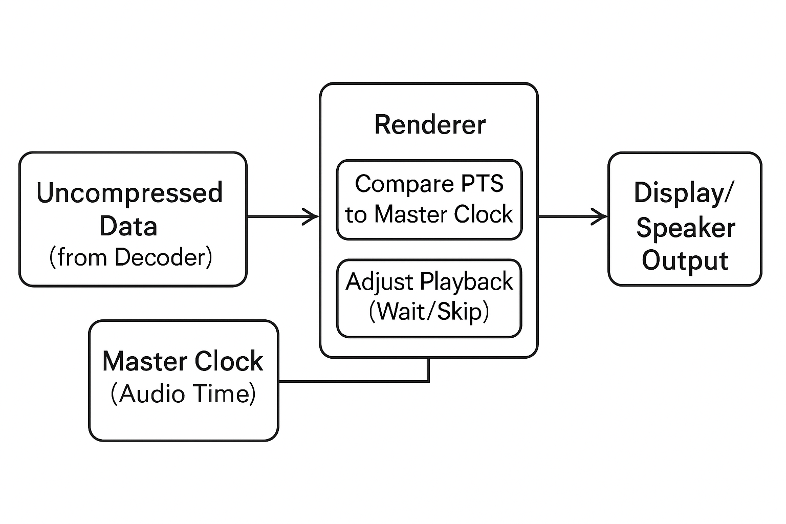 - 映像Renderer: 映像フレームを受け取ると、そのフレームのPTSと、現在のマスタークロックを比較します。